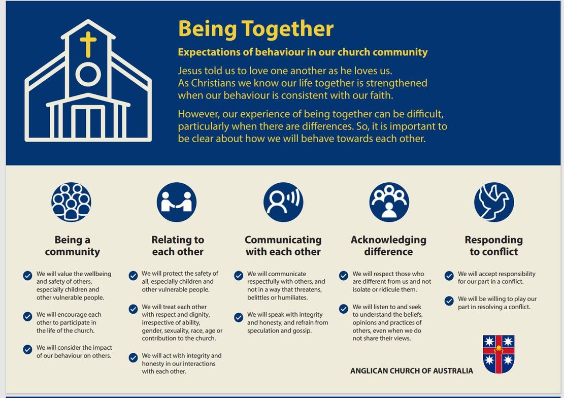 This resource forms part of our response to the Anglican Church of Australia’s ‘Being Together’ statement. ‘Being Together’ is about honouring the wellbeing, safety, dignity and giftings of others. It is about encouraging one another; listening to one another; being honest, caring and respectful; acting with integrity; and, being discerning about what we say and do.